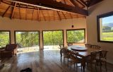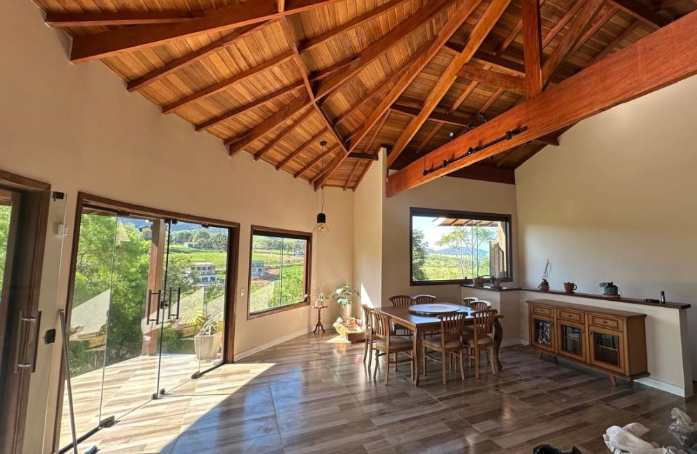 SALA ENORME LINDA COM MADEIRAMENTO APARENTE E COZINHA ESTILO AMERICANA